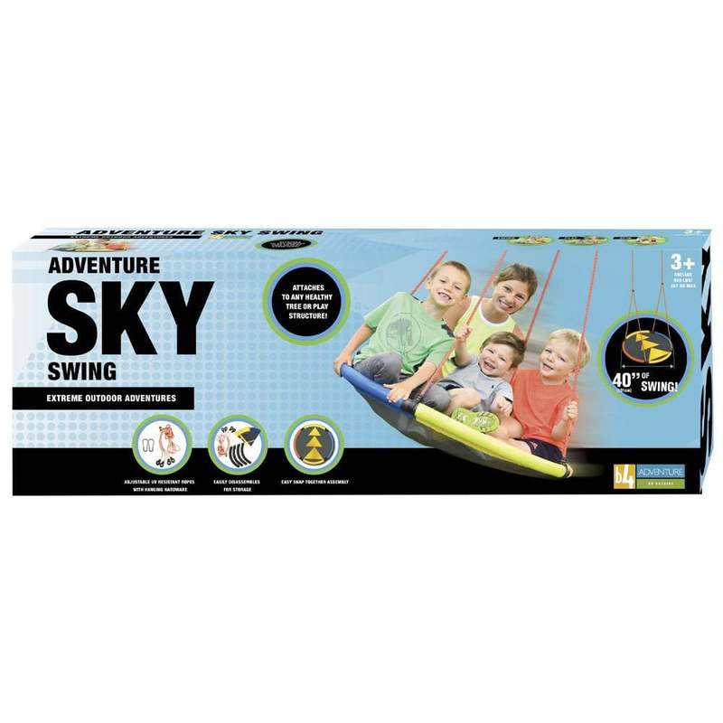 Soar to new heights with your lightweight Adventure Sky Swing. Hang your 100cm diameter swing from a healthy tree branch or an existing play structure with 6ft adjustable ropes and carabiner clips.
