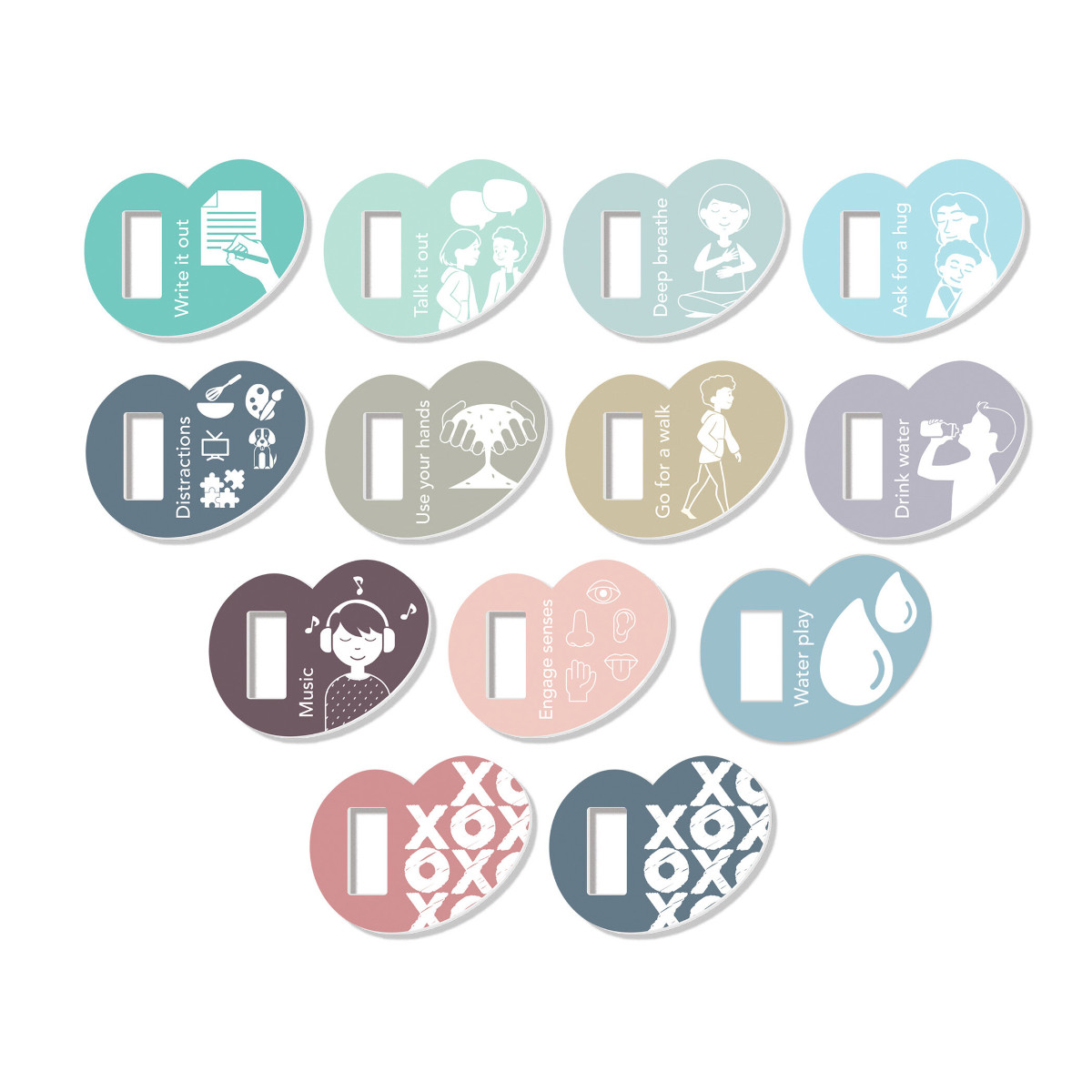 The Remindables Anxiety Set is designed to provide on-the-go support for managing stress and emotions. By incorporating colour, visuals, and words, the set offers multiple sensory cues to assist with memory recall and emotional regulation: